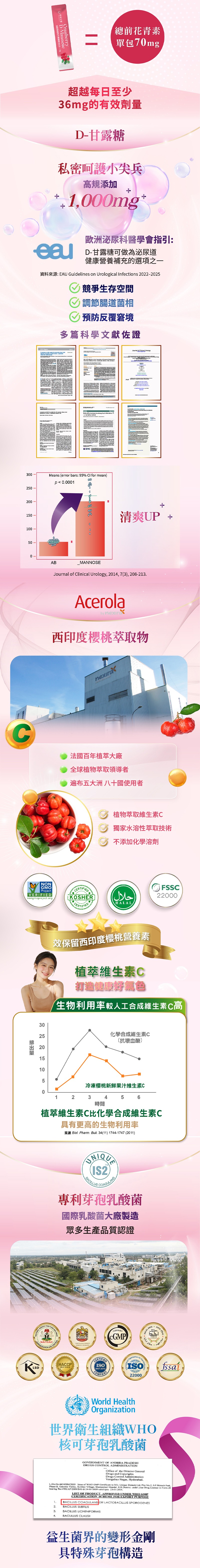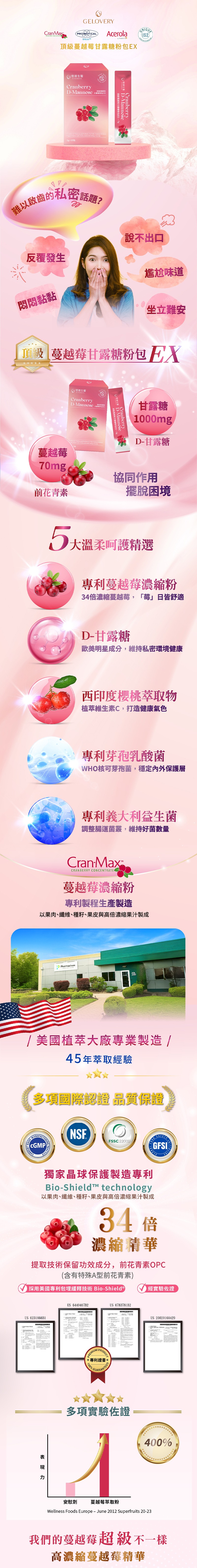 嚴選全球頂尖專利成分,結合高濃度 D-甘露糖、Cran-Max® 專利蔓越莓與雙重專利益生菌。